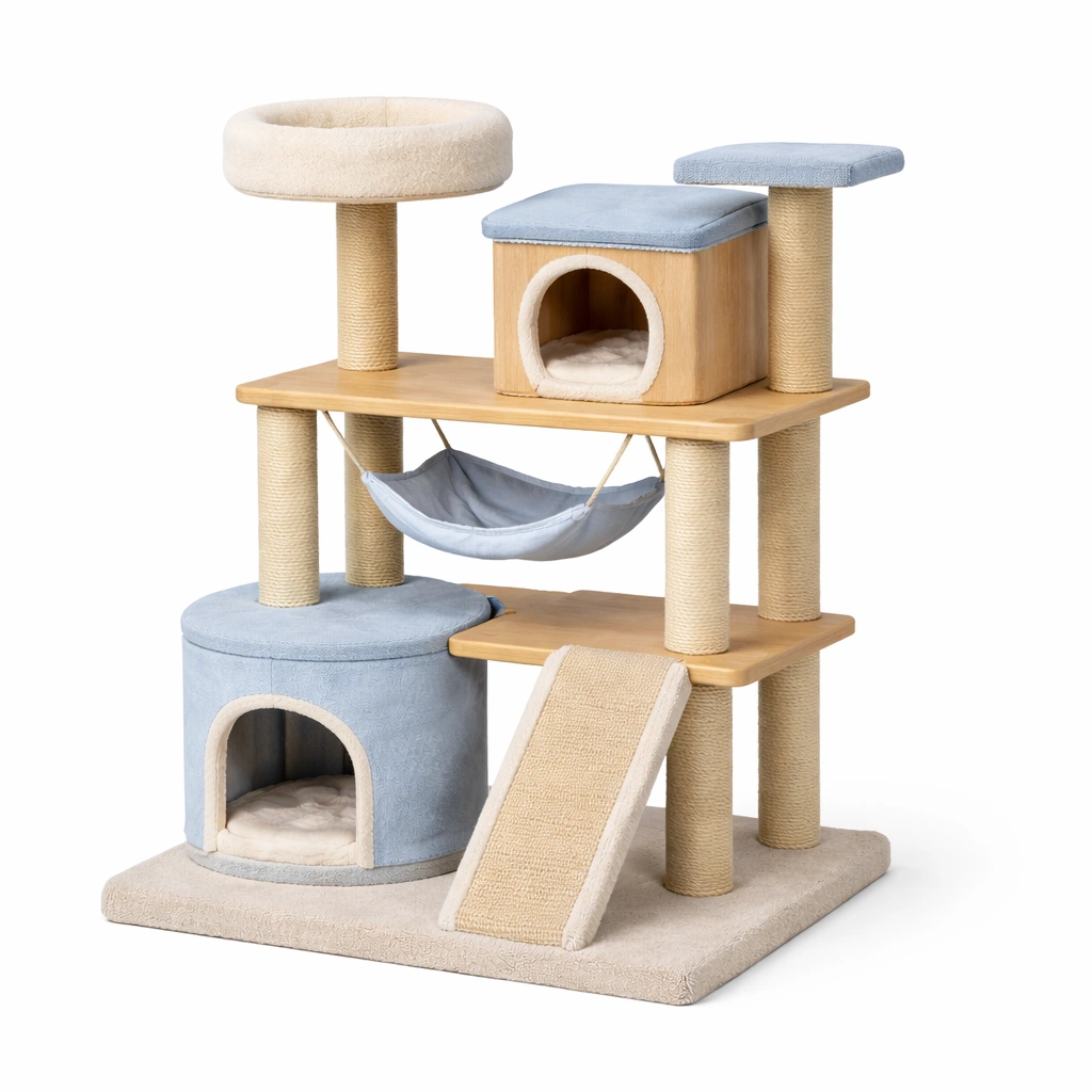Contiene: 1 amaca, 2 cucce imbottite, 1 rampa in tessuto antigraffio.